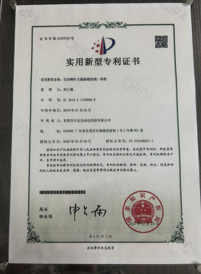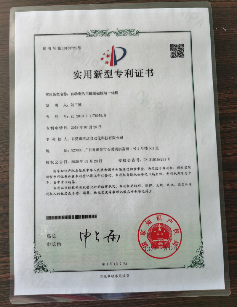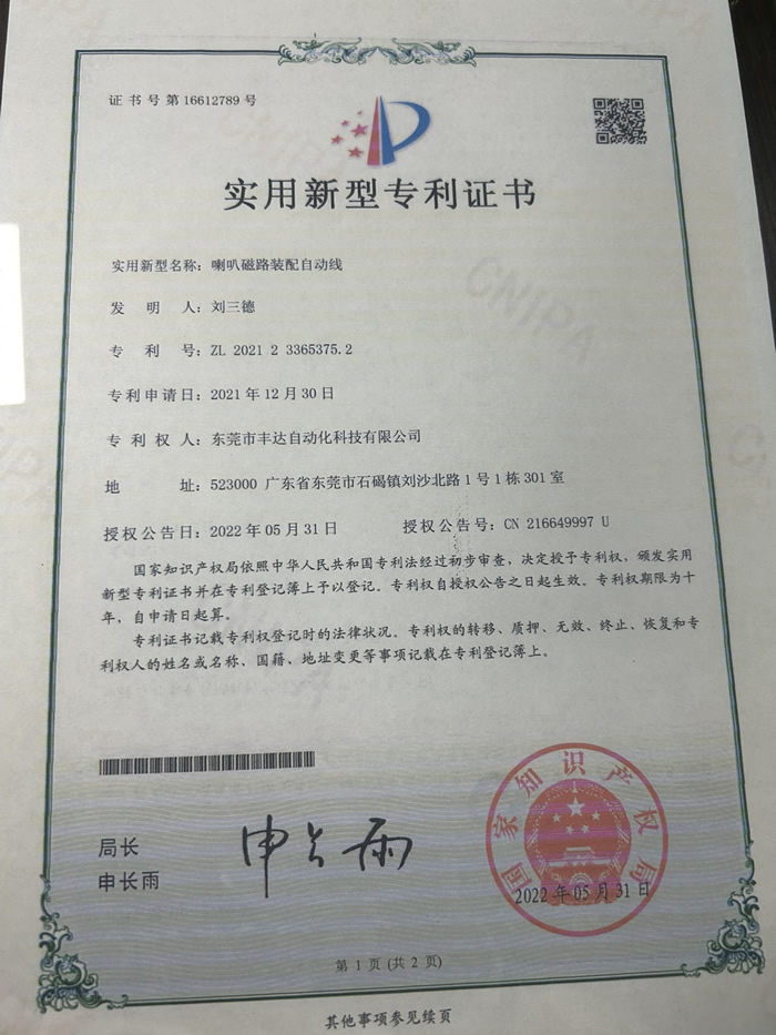 喇叭自动组装线.实用新型专利证书