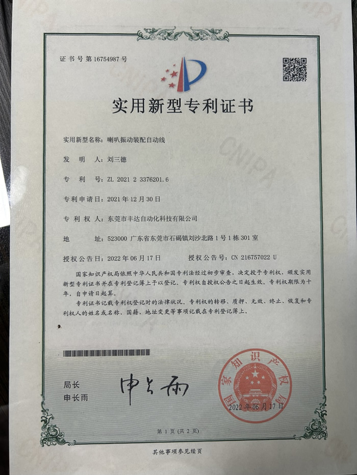 喇叭振动装配自动线.实用新型专利证书